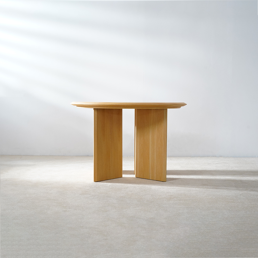 Tämä moderni ruokapöytä on tuettu neljällä paksunnetulla massiivipuupalikalla molemmilta puolilta.Akseli on hajautettu ja suunniteltu yhdistämään mekaniikka ja geometrinen estetiikka.